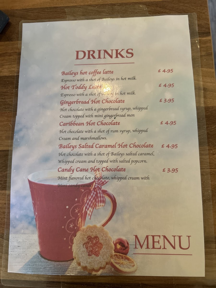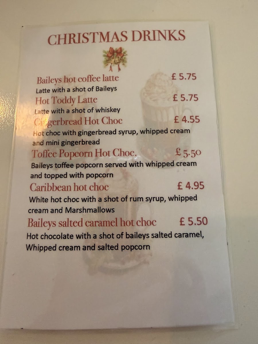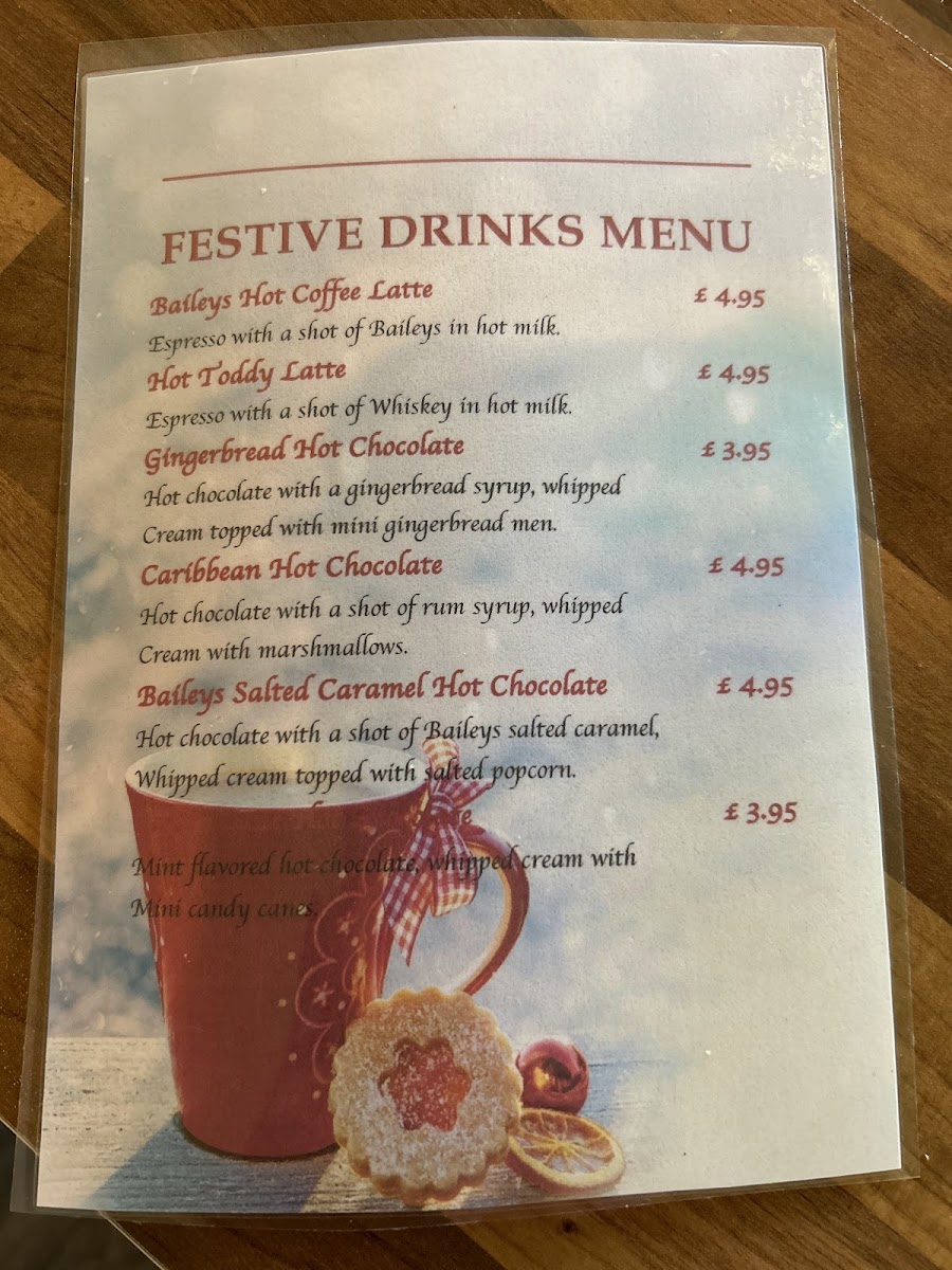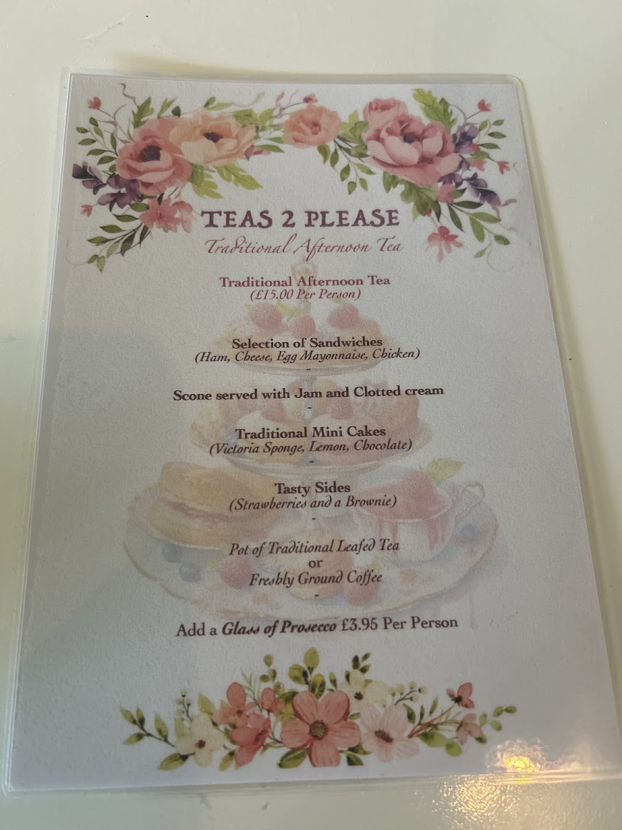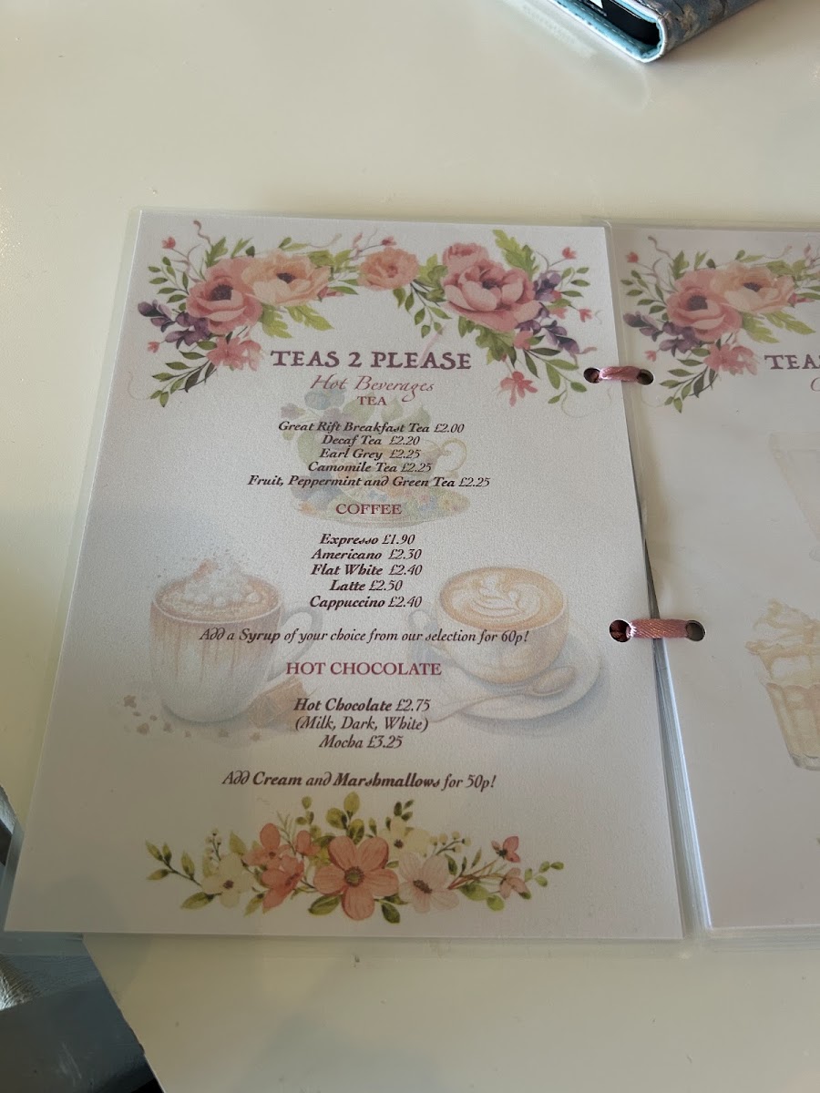 From a reviewer’s perspective, the menu at Teas 2 Please offers a charming and cozy selection, though it leans more toward variety than detailed pricing transparency. The sandwich options, such as Cheese & Pickle On White Bread, Cucumber & Cream Cheese On Brown Seeded, and Ham Salad On Soft Cob, provide classic, comforting choices, while items like Sausage & Cheese / Pineapple On A Stick and Prawn Vol Au Vont & Quiche add a slightly more indulgent touch. The drinks menu stands out with festive specialties including Baileys Hot Coffee Latte, Hot Toddy Latte, Gingerbread Hot Chocolate, and Caribbean Hot Chocolate, alongside staples like Americano, Flat White, Latte, and Cappuccino, plus treats such as Hot Chocolate and Mocha. The afternoon tea selections are particularly appealing, featuring delights like Homemade Scone With Strawberry Jam & Clotted Cream, Mini Chocolate Orange Cake, Mini Lemon Tart With A Butterfly On Top, and Mini Jammie Dodger Cheesecake In Shot Glass, all presented with a playful, indulgent flair. Additional bites like Egg & Cress Served On White Finger Bread, Beef & Horseradish Served On Brown Seeded, Homemade Cherry Scone, and Mini Victoria Sponge round out the offering nicely. While the absence of listed prices makes it harder to gauge value, the menu’s variety and nostalgic, tea-room charm leave a warm and inviting impression overall.